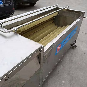 清洗機(jī)工作過(guò)程是將物料放入清洗機(jī)后,毛刷輥旋轉(zhuǎn)刷洗物料并使其不斷翻轉(zhuǎn),以達(dá)到去皮、去毛雜的效果,同時(shí)排水管不斷噴淋,把從原料上刷洗下來(lái)的污物沖洗掉。毛輥清洗機(jī)在清洗過(guò)程中,雜質(zhì)被毛刷刷掉,跟隨水流,進(jìn)入底部的蓄水池,蓄水池中的水可循環(huán)噴淋使用。蓄水池上方設(shè)有過(guò)濾網(wǎng),過(guò)濾漂浮物能夠直接截留在蓄水池上方的過(guò)濾網(wǎng)上,保證蓄水池中循環(huán)用水的干凈。